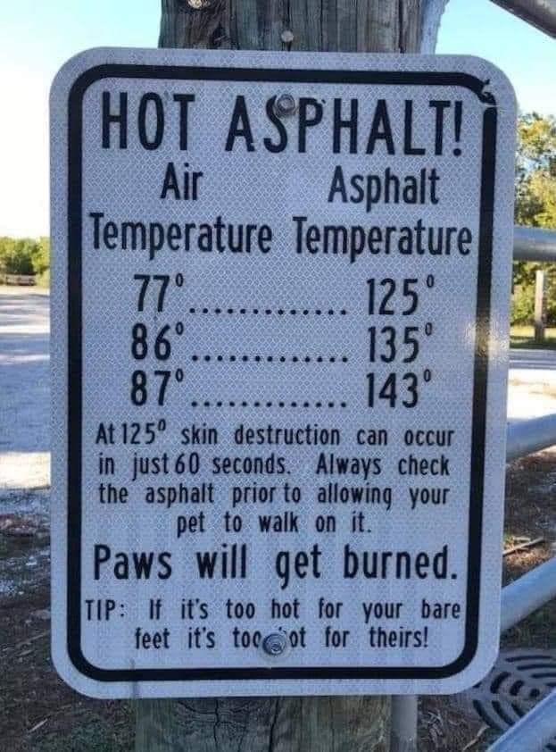 @raphjd While the IDEA of that sign is very helpful, it is not that accurate. For instance.. it is not air temperature that is the issue, but whether or not the SUN is beating down on the asphalt (or concrete). For instance.. let's say it is 90 degrees F out.. That is certainly hot, but not deadly. If you stand on asphalt that is in the SHADE of a tree or otherwise not being blasted by the sun, it is not that hot.. but if it is being exposed to the sun, it will fry your bacon! Air temperature is not the critical factor. Also, if you stand on the grass - even if the grass is exposed to direct sunlight, it doesn't get that hot. And.. if something is wet.. you know it is not over 212 F.. because if it was, that water would evaporate. The temperature would not rise above 212 F until all the water was gone. Likewise, if you see fresh water in a lake.. you know that the water is at least 32 F. It cannot be colder than 32 F until the water is frozen to ice.