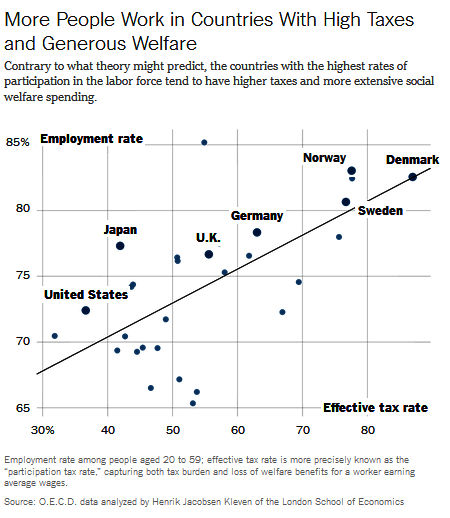 Some of the highest employment rates in the advanced world are in places with the highest taxes and most generous welfare systems, namely Scandinavian countries. The United States and many other nations with relatively low taxes and a smaller social safety net actually have substantially lower rates of employment.