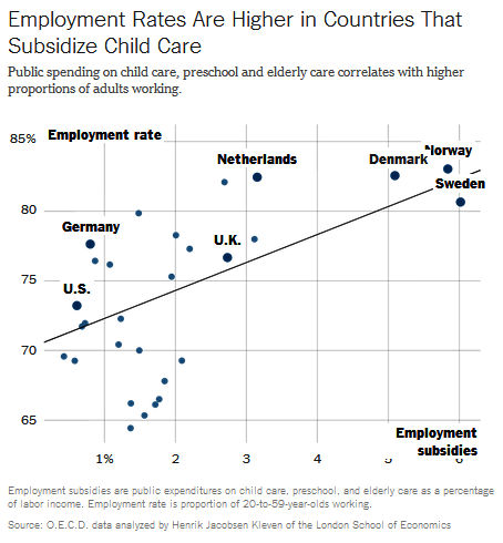 There is a solid correlation, by Mr. Kleven’s calculations, between what countries spend on employment subsidies — like child care, preschool and care for older adults — and what percentage of their working-age population is in the labor force.