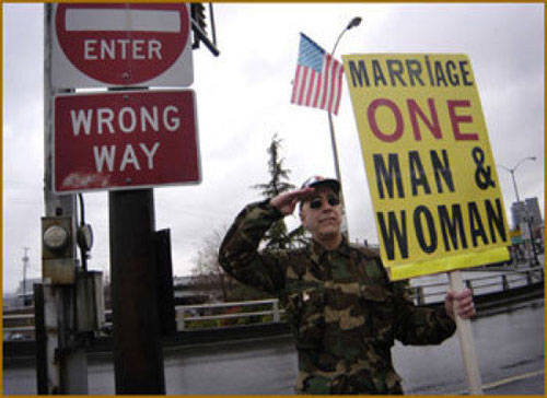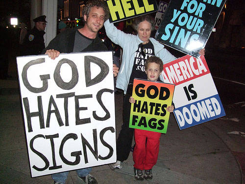 Please tell me the guy holding the sign "Homosexuals are Gay" was photoshopped. Even they can't be this stupid, can they? I think my favorite is "who do you think designed your wedding dress?"