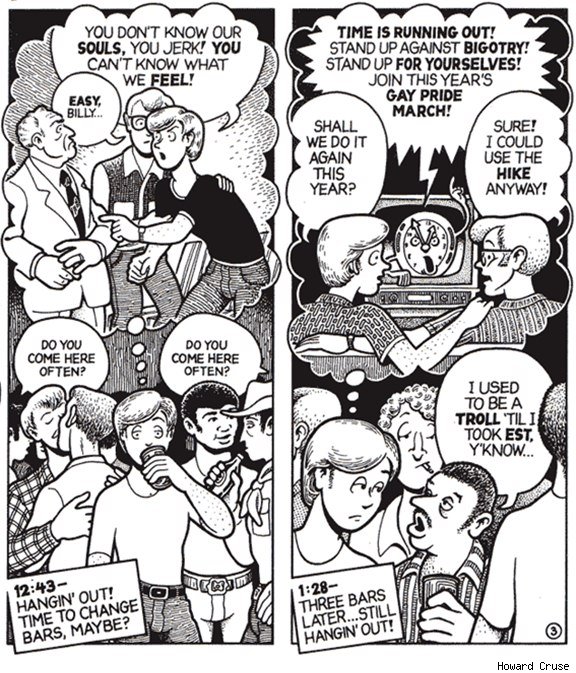 CA: I came of age in the 90s, and I expected the comics from the 70s and 80s to feel like a time capsule of a previous generation's gay culture and gay attitudes, but I was surprised that I found it very resonant and very relevant, and I recognized the culture and the attitudes today. Did you have that experience?