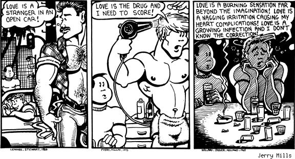 I would love to see some collections of some of the cartoonists, the European cartoonists, translations of some of their work, and maybe some of the earlier generation of American gay cartoonists. For example Jerry Mills who did the strip Poppers, that's an amazing comic, and he's dead, he died of AIDS unfortunately and is survived by his wonderful partner Sal, and his work is just fantastic. It's kind of a time capsule of gay realities and gay humor at the time, but it also still reads very fresh. It would be wonderful to have a good beautiful collection of his work. There's a lot of stuff like this that really should be collected.