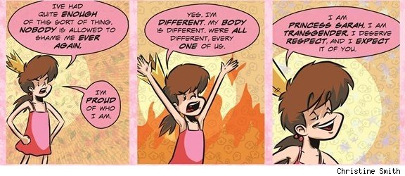 Christine Smith, for example, is a web cartoonist who does a strip called The Princess about a trans girl and her family and friends. She was one of the recipients of the Queer Press Grant this year, in fact. She's basically creating a strip to help the little girl that she was when she was young, who never had any support. She's doing this for the new generation of trans children, creating role models, showing them images of themselves in a non-pathological way, and allowing them to be who they are.