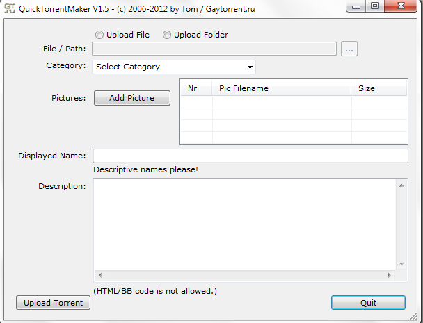 Το QuickTorrentMaker (QTM) είναι μία εφαρμογή που δημιουργήθηκε από τον ιδιοκτήτη του site ειδικά για το Gaytorrent.ru. Σκοπός του είναι να απλουστεύσει τη διαδικασία δημιουργίας αρχείων .torrent και να διευκολύνει το ανέβασμά τους στο site.
