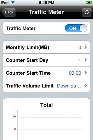 The Netgear genie is capable of measuring not monitoring network traffic, through the program's Traffic Meter. The Traffic Meter measures the amount of Internet traffic for today, yesterday, this week, this month, or last month. Each time period measured includes data for connection time, upload/average, download/average, and total/average. An app may be placed on a person's phone displaying the Traffic Meter, which looks like this: